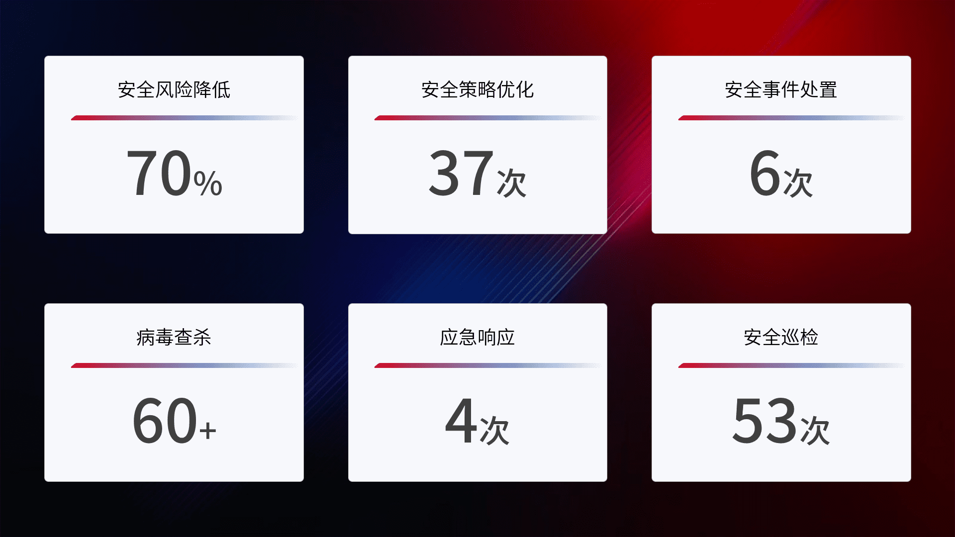 提供全面的安全事件报告体系,,包括处置报告、、、、周报、、、季度和年度总结,,,,结合持续监控,,,帮助客户深入了解网络安全状况。。。